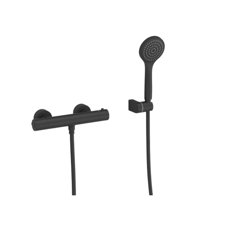 Grifo termostático mural de ducha TRES en acabado negro mate. Incluye ducha de mano anticalcárea Ø 100 mm, flexo satinado y soporte orientable. Fabricado en latón con bajo contenido en plomo, resistente a la corrosión. Caudal aproximado de 11 l/min y fácil instalación.